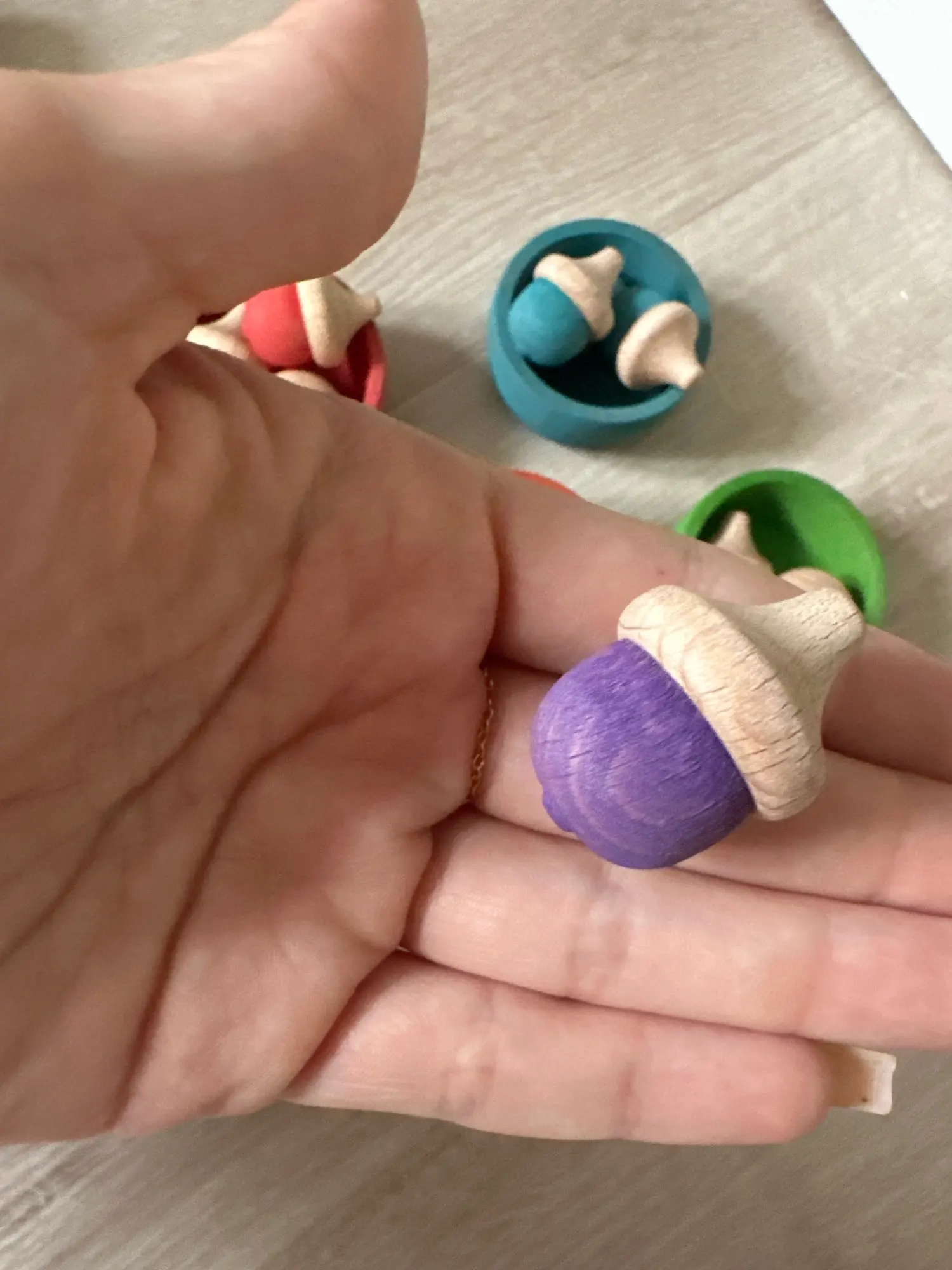 Colorful wooden acorn-shaped toys on a table with a hand holding a green one.