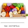 Cut Fruits and Vegetables Wooden Toys set in a wooden box, featuring colorful, safe play items for imaginative cooking and motor skill development. Ideal for Montessori learning.