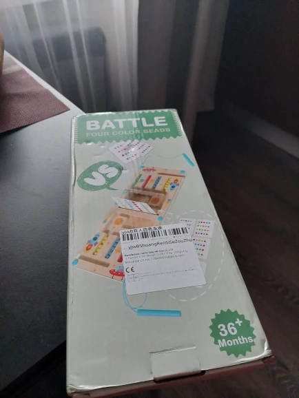 Wooden educational toy with colorful beads and game cards, accompanied by its packaging.