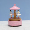 Wooden carousel toy with ballerina figures on a pink base against a blue background
