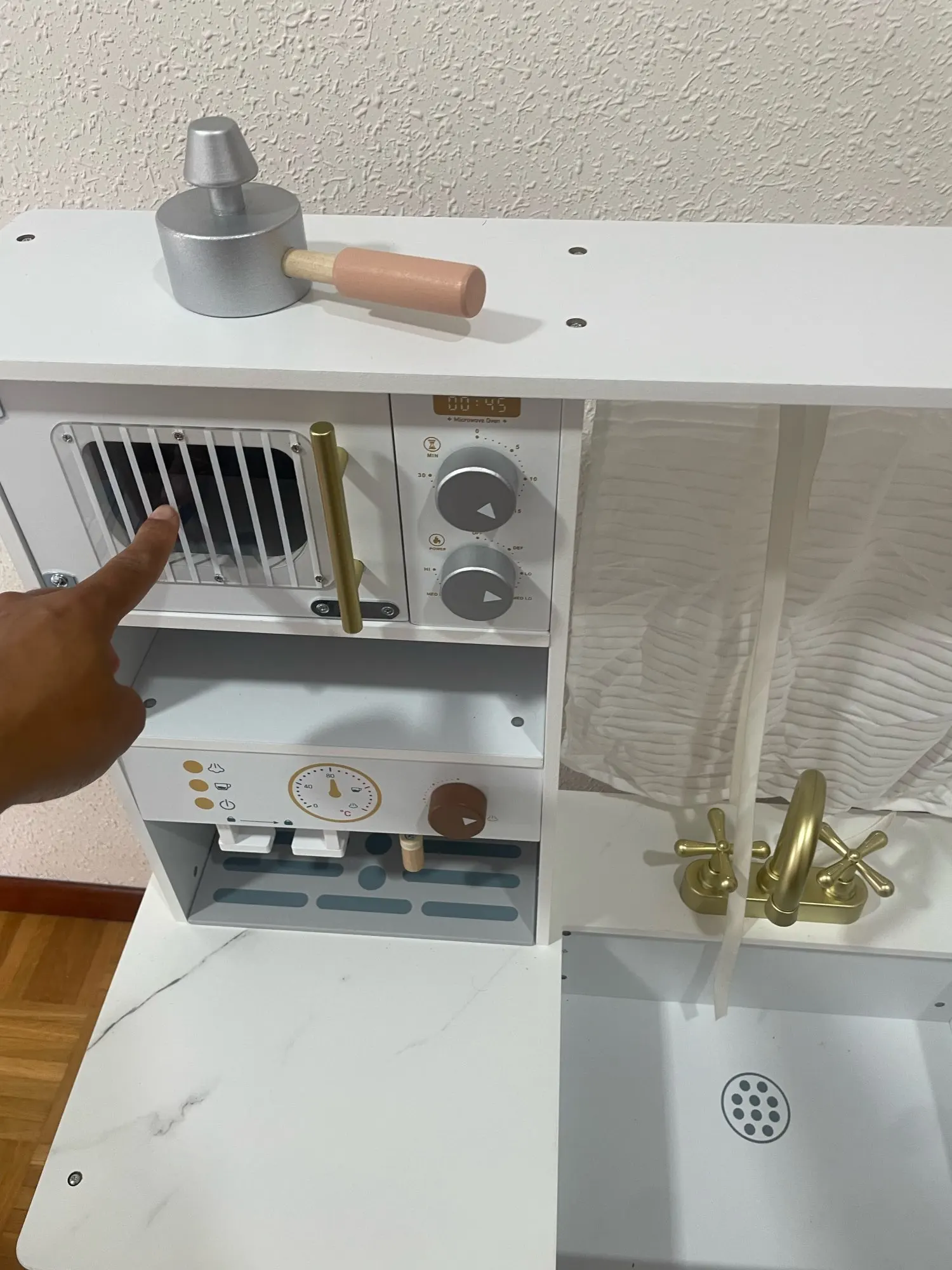 White play kitchen set with gold accents in a room with white walls and wooden floor.