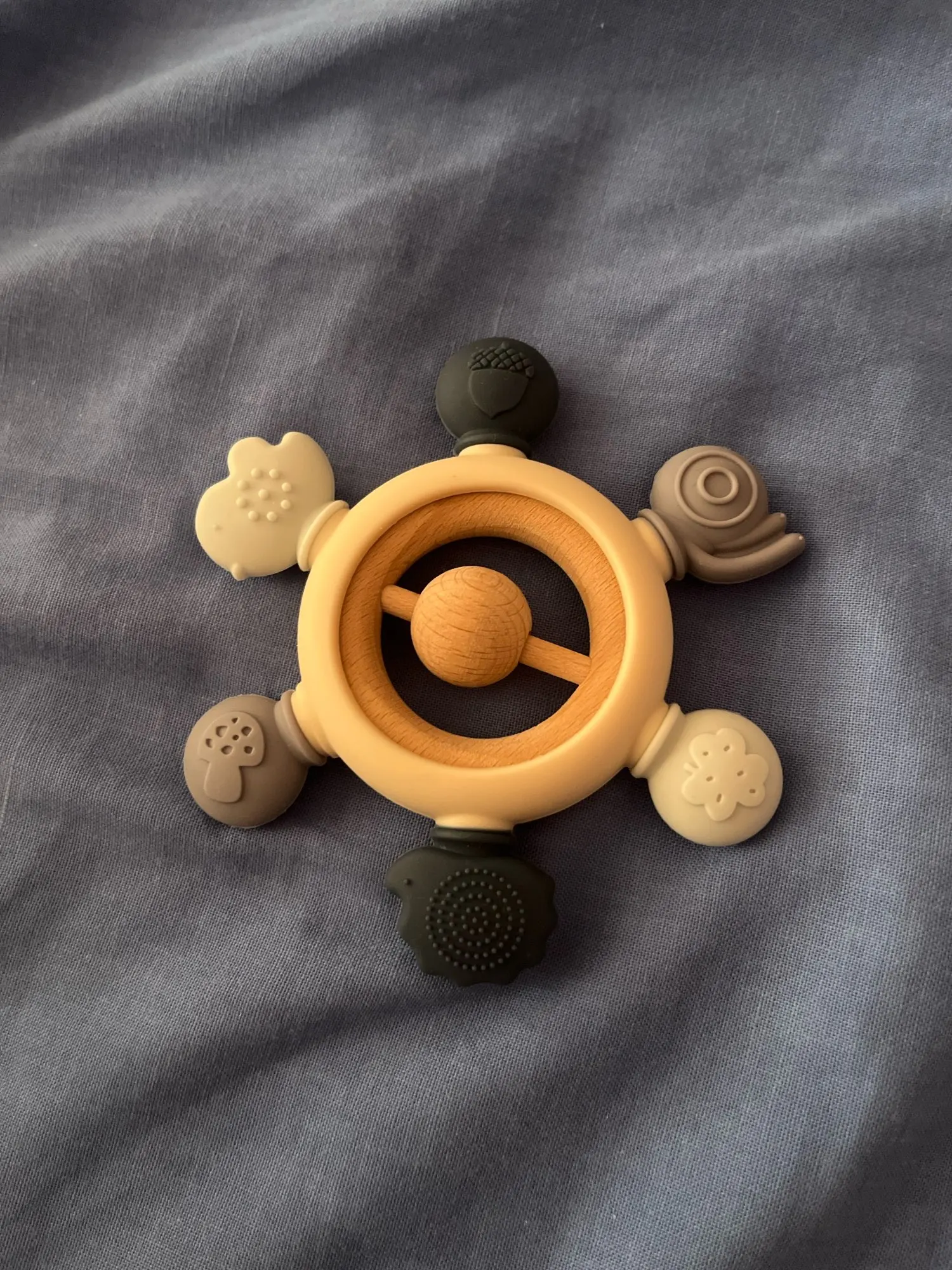 Wooden Baby Forest Teethers featuring eco-friendly rattling beads, designed to aid cognitive development during the teething stage.