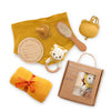 A collection of baby items including a dinosaur-shaped toy, rolled-up white blanket with yellow ribbon, and baby bath mat, embodying eco-friendly early learning.