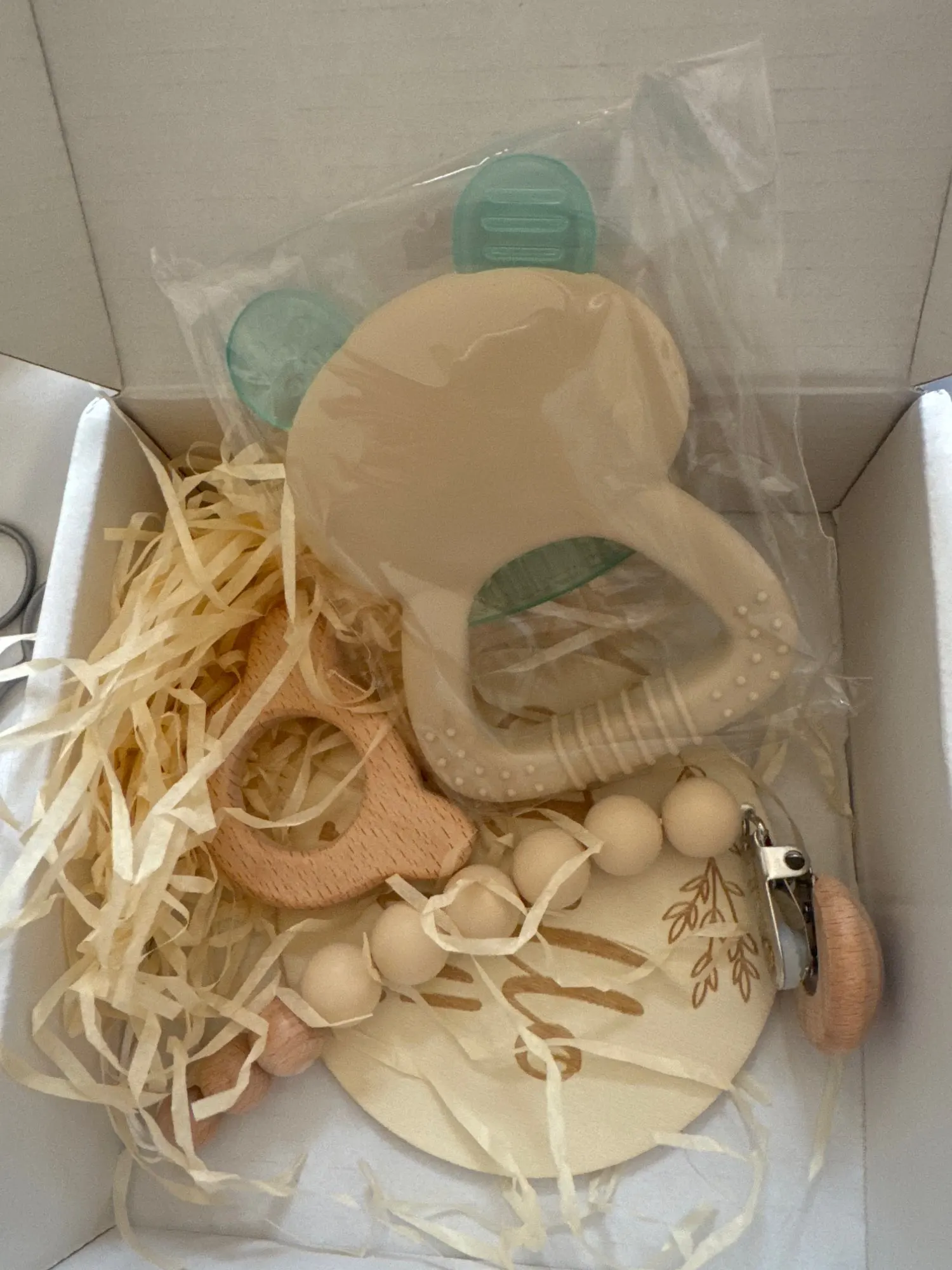 Baby teething toy set with wooden and silicone elements in a decorative box.