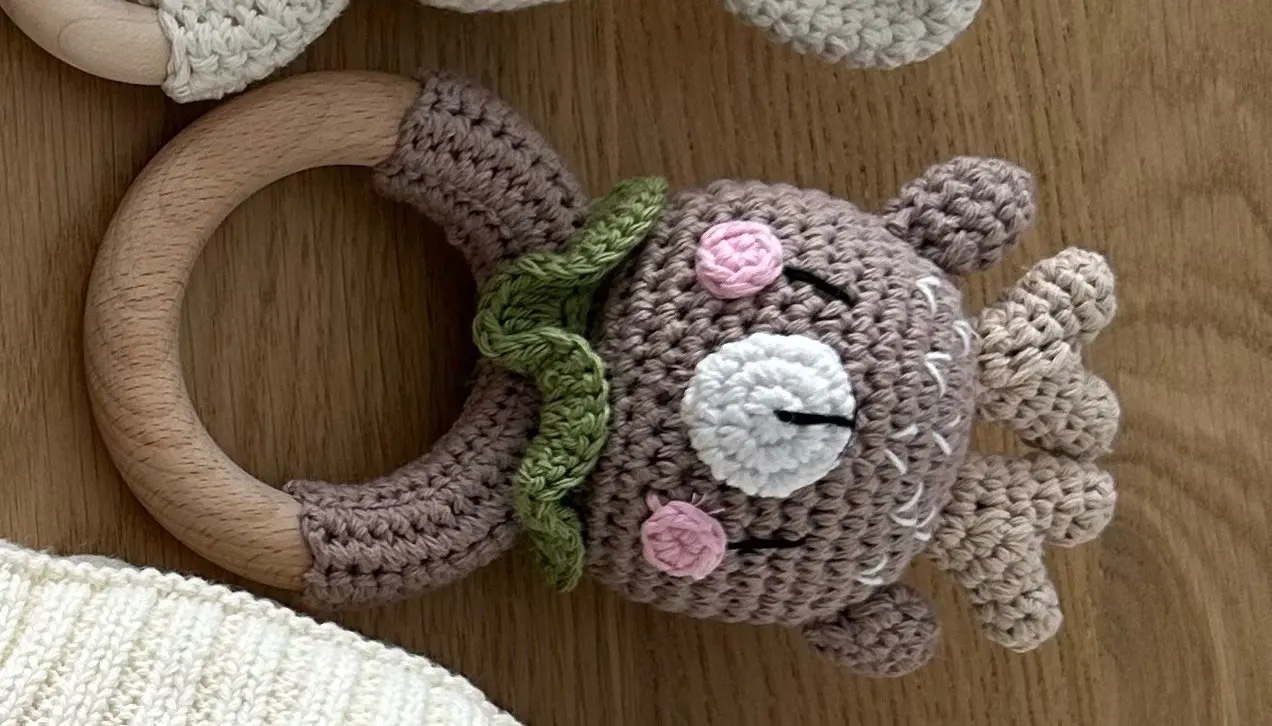 Bunny Woodland Crochet Rattle, a knitted toy with a bunny face, combines soft crochet and wooden elements for sensory exploration. Ideal for infants' tactile development.