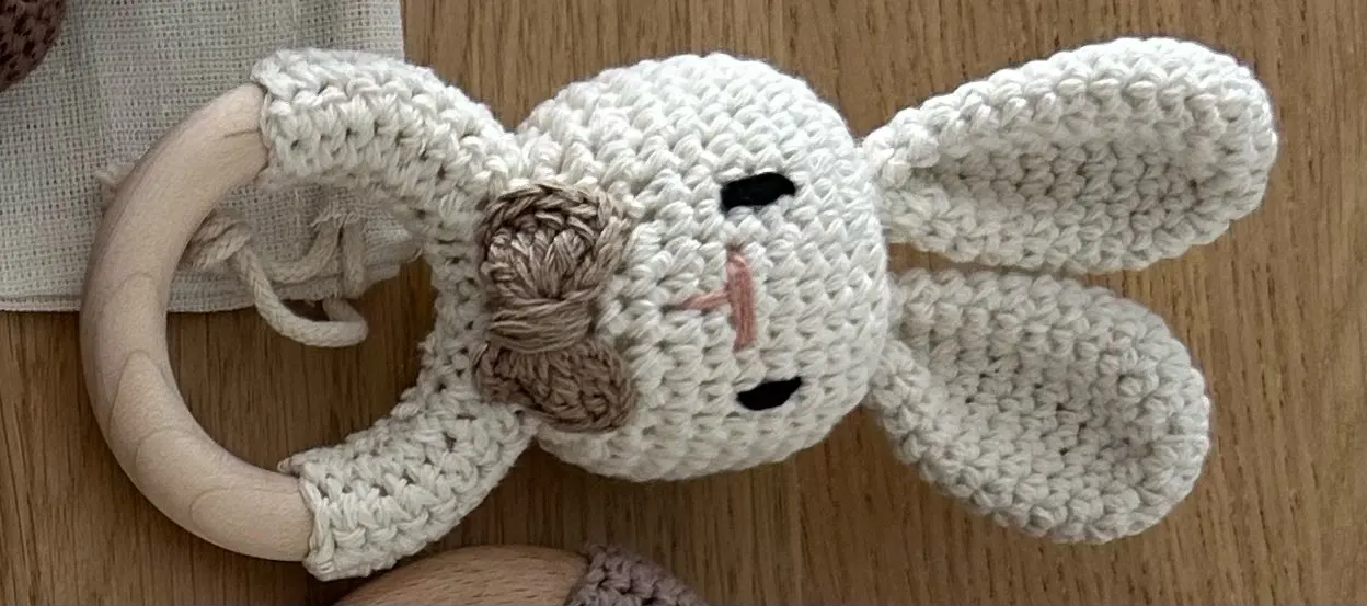 Bunny Woodland Crochet Rattle, a handcrafted wooden bunny with soft crochet detailing, designed for sensory exploration and tactile development, perfect for little hands.