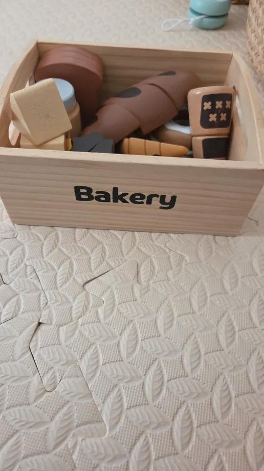 Wooden bakery set with various food items and a crate labeled 'Bakery' on a white background.