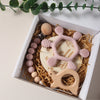 Pink and wooden baby teething toys in a gift box with decorative elements.