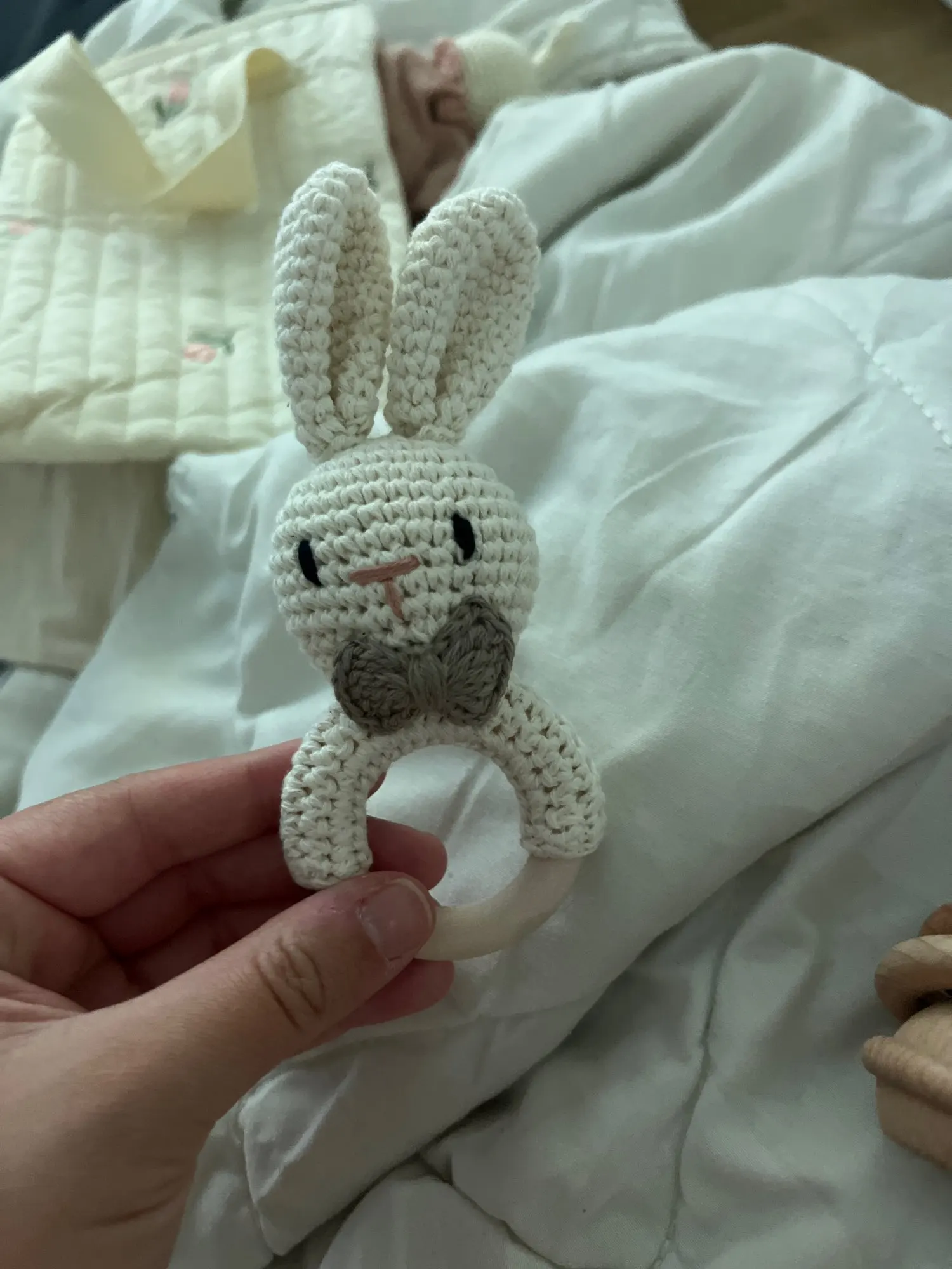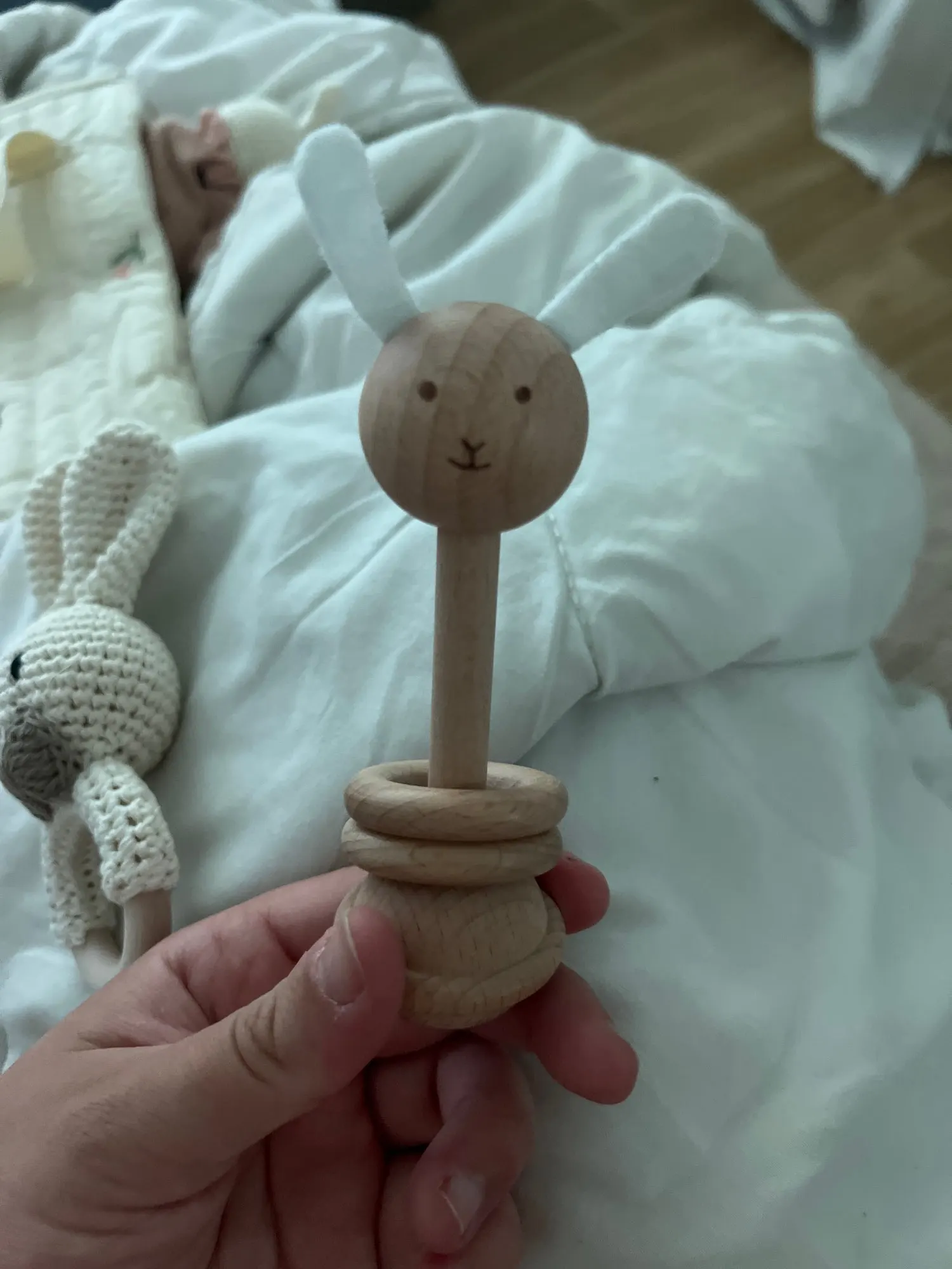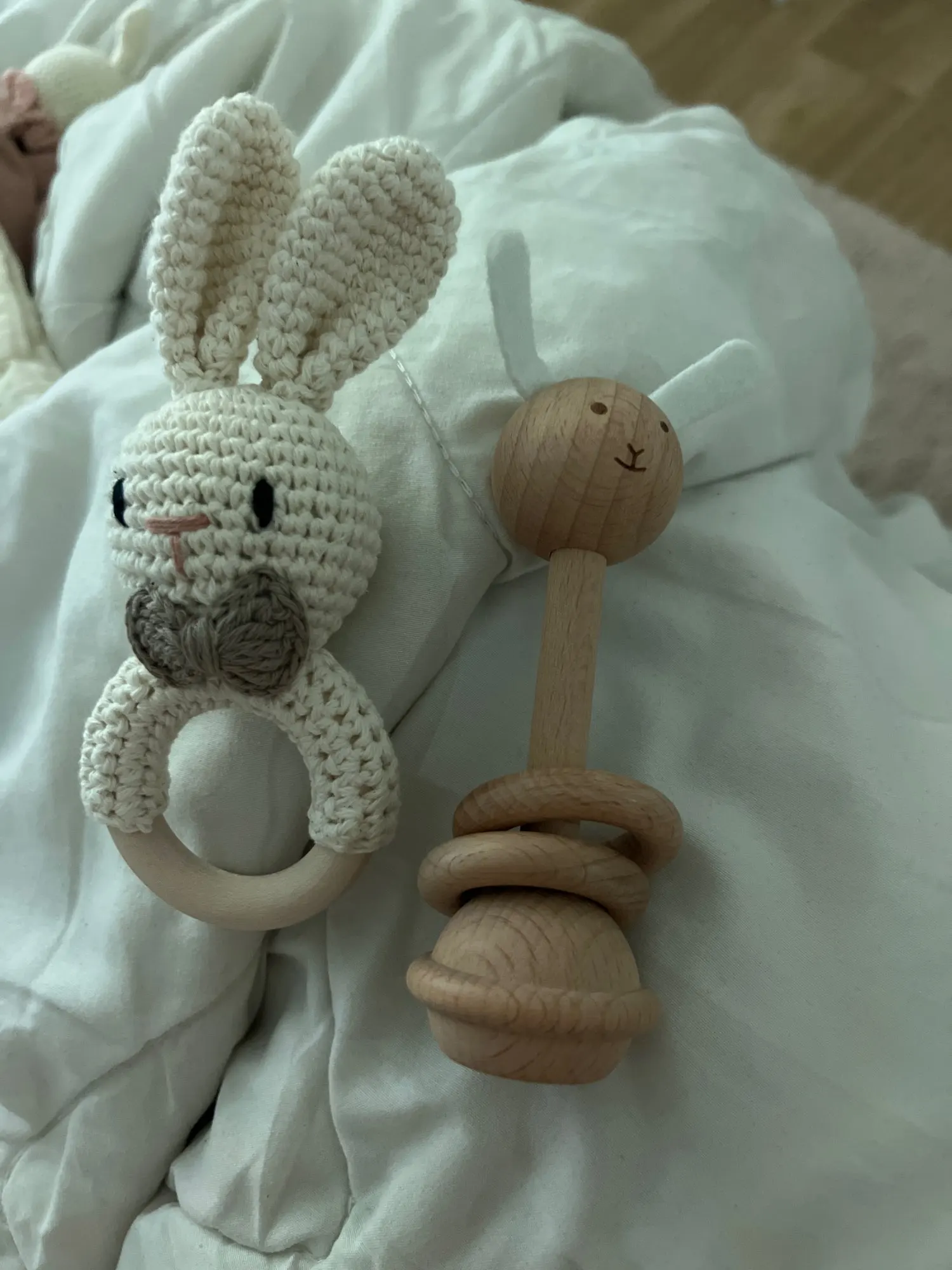 Handcrafted with care using high-quality beech wood and soft crochet materials. Perfect size for little hands to grasp and shake. The gentle rattling sounds engage baby's hearing, while the contrasting textures stimulate tactile development. Makes a beautiful gift set for newborns!